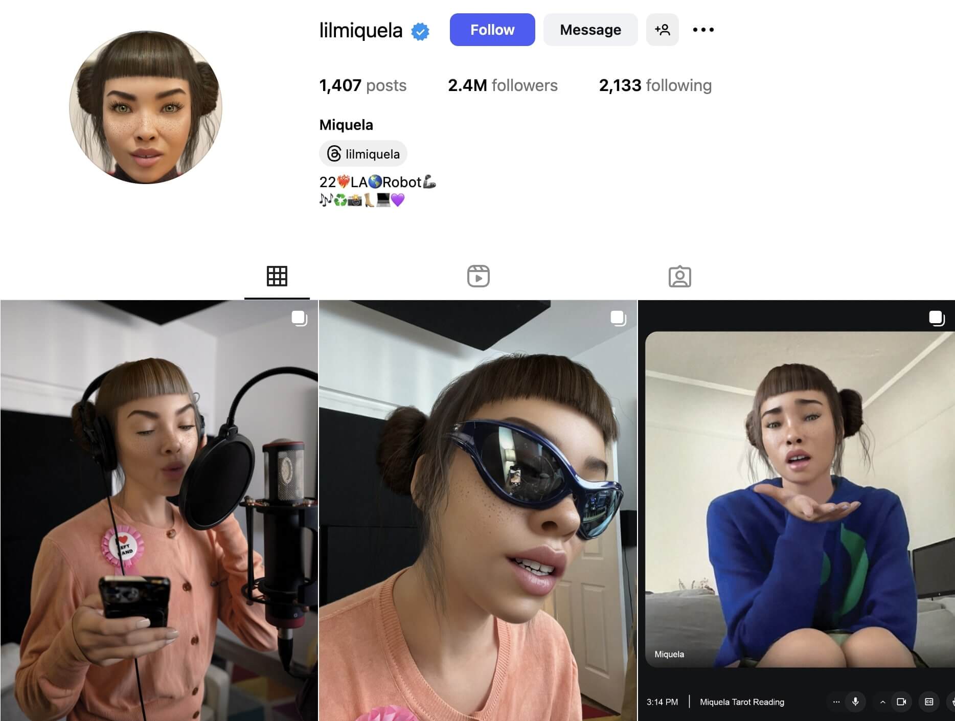 Lil Miquela’s narrative begins as a fictional Instagram profile that portrays her life as a model and a musician.
