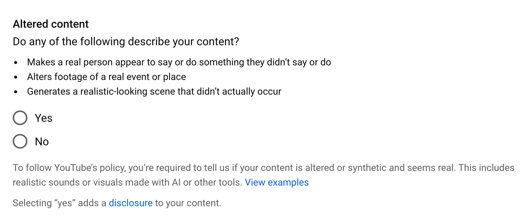 AI-generated content can help with speed and volume, but it won’t automatically rank unless it delivers genuine value and originality. Google and YouTube also require disclosure for AI-generated or altered content. Failure to disclose may harm your trust and visibility.