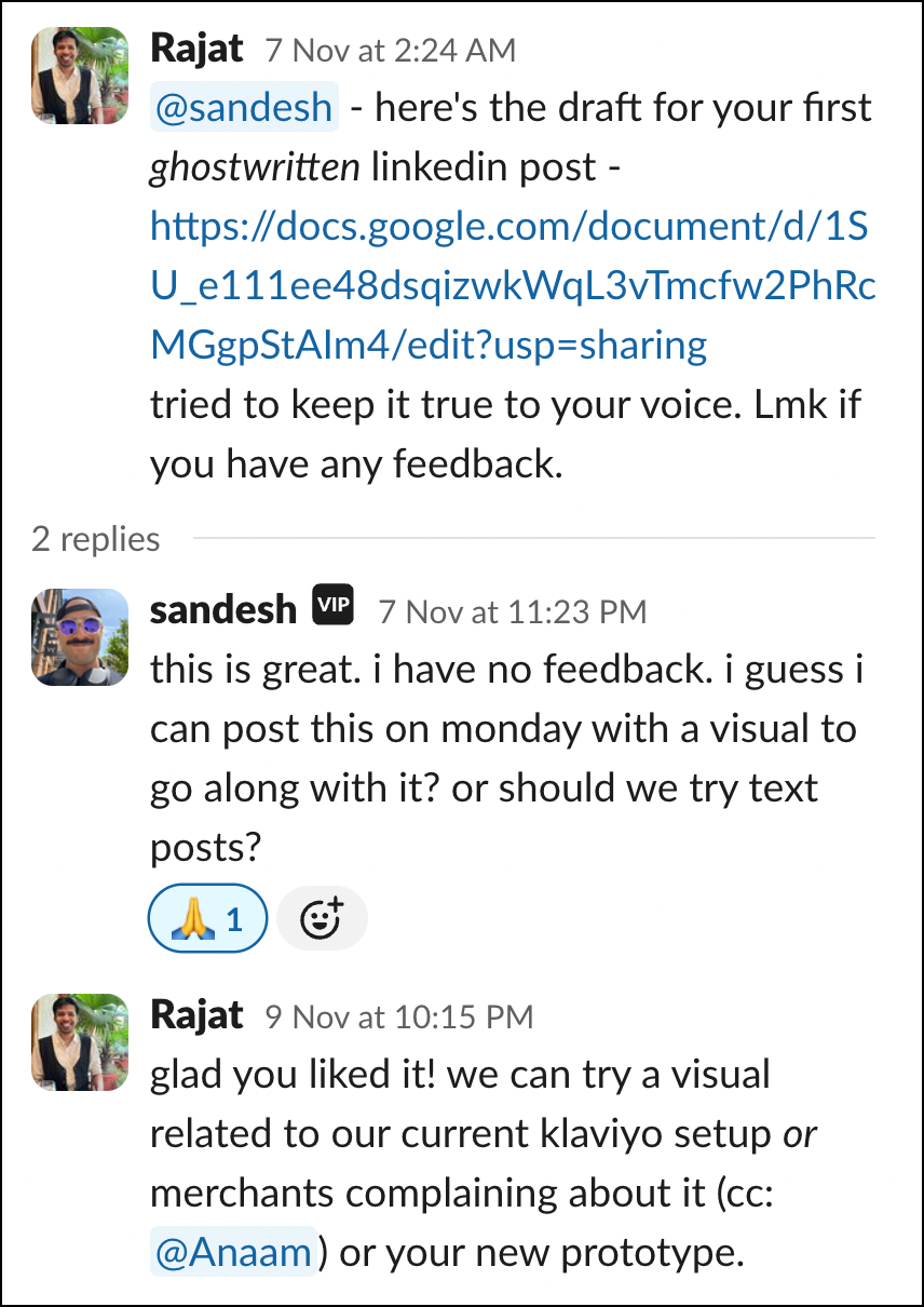 So, we started looking for a "leadership ghostwriter" who can help take our ideas from our head and create engaging content in our own authentic voice across different platforms, starting with Linkedin. (sandesh is already active on X)